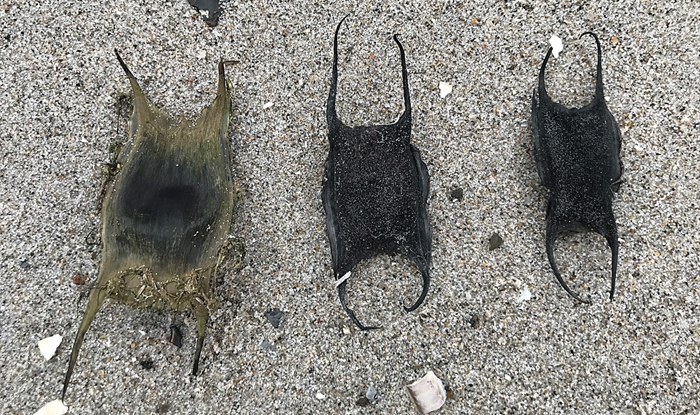 Foto 5: Ægkapsler fra en sømrokke (venstre) og fra tærber (midten og højre) fundet ved Vesterhavet. Man kan fornemme, at ægkapslen fra sømrokken er væsentlig større. Foto: Mette Schiønning.