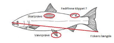 - En vævsprøve udtages ved at klippe eller snitte et stykke af bugfinnen (se illustration). Størrelsen på det afklippede væv skal være ca. som en fingernegl. Det er vigtigt ikke at tage for meget væv, for så fordærves det hurtigere i prøve-røret. Vævet puttes i røret med sprit. Ryst røret for at være sikker på at vævet holder sig i spritten. Hvis spritten ved en fejl spildes, kan den ikke erstattes af husholdningssprit. Så må der i stedet anvendes et rør fra et nyt prøvesæt.